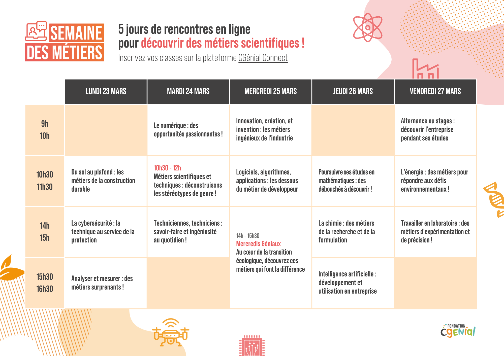 La Fondation CGénial propose aux élèves du secondaire une à deux fois par an, une semaine de rencontres en ligne avec des professionnels des domaines scientifiques, techniques et du numérique. Chaque rencontre virtuelle permet aux élèves de découvrir une palette de formations et de métiers variés pour les aider dans leur orientation.